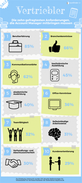Aber der beste Account Manager bringt nichts, wenn er den Kunden nicht für sich und sein Angebot gewinnen kann. In 30% der ausgeschriebenen Stellen ist Verhandlungs- und Abschlusssicherheit daher eine Schlüsselqualifikation, die Bewerber mitbringen müssen. Dicht gefolgt vom letzten Platz der Top Ten: Kundenorientierung. Der Kunde ist König. Diese Ansage ist in 29 von 100 Stellenanzeigen zu finden.