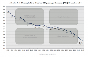 Berlin – airberlin hat 2013 ihren durchschnittlichen Treibstoffverbrauch auf 3,3 Liter pro 100 geflogene Passagierkilometer (PKM) gesenkt. Das entspricht einer Verbesserung von 2,7 Prozent gegenüber dem Vorjahr (3,4 Liter). Damit liegt airberlin mehr als ein Prozent über der von der IATA geforderten jährlichen Verbesserung von 1,5 Prozent. Insgesamt hat airberlin im vergangenen Jahr durch die Treibstoffreduktion etwa 70.000 Tonnen CO2 eingespart. Das entspricht rund 4.700 Flügen von München nach Palma de Mallorca. Mittelfristig will Deutschlands zweitgrößte Airline ihren Treibstoffverbrauch auf 3 Liter pro 100 PKM senken.
