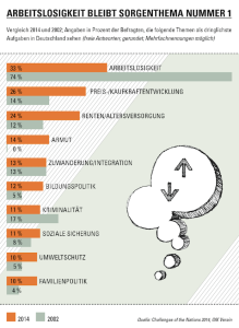 Seit mehr als 20 Jahren unangefochtener Spitzenreiter der deutschen Sorgenliste ist und bleibt die Arbeitslosigkeit: 33 Prozent nennen die Situation auf dem Arbeitsmarkt als wichtigste Herausforderung. Allerdings hat sich der Wert seit dem Krisenjahr 2009 halbiert – damals betrug er noch 66 Prozent. Auch die tatsächliche Arbeitslosenquote nach dem internationalen ILO-Standard war im Februar 2014 mit 5,1 Prozent so niedrig wie seit 20 Jahren nicht mehr. Dabei ist die Besorgnis mit 40 Prozent in den Neuen Bundesländern weiterhin präsenter als im Westen mit 32 Prozent. Erklären lässt sich dies durch eine rund vier Prozentpunkte höhere Arbeitslosenquote im Osten.