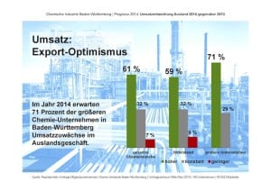 59 Prozent der Chemie-Unternehmen im Land rechnen mit Umsatzzuwächsen. Von steigenden Auslandsumsätzen gehen besonders die größeren Unternehmen zu mehr als zwei Dritteln aus. 45 Prozent aller Unternehmen erwarten eine steigende Binnennachfrage.