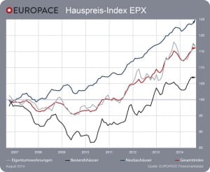 „Die – zumindest kurzfristige – Stabilisierung des Hauspreis-Index EPX bestätigt unsere Annahmen, dass der Aufwärtstrend der Immobilienpreise zwar grundsätzlich anhält, sich in diesem Jahr aber in einem moderateren Maß fortsetzt“, erläutert Thilo Wiegand, Vorstandsvorsitzender der Europace AG. „Die außerordentlich starken Zuwachsraten der vergangenen Jahre werden 2014 voraussichtlich nicht mehr erreicht. Käufer bewegen sich inzwischen in einem höheren Preisumfeld und wägen vor der Investition in eine Immobilie kritischer ab.“ Nichtsdestotrotz bleibt die hohe Nachfrage nach Wohnimmobilien als Vorsorgemöglichkeit und attraktive Anlagevariante bestehen.