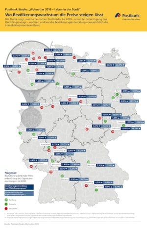 Die Postbank Studie „Wohnatlas 2016 – Leben in der Stadt“ wurde unter der Leitung von Michael Bräuninger durchgeführt, Professor an der Helmut-Schmidt-Universität und Experte für Economic Trends Research. Analysiert wurden die 30 größten deutschen Städte sowie sechs Städte, die jeweils die größten eines Bundeslandes sind und nicht zu den Top 30 gehören. Im Fokus der beschriebenen Analyse standen die Bevölkerungsentwicklung unter Berücksichtigung des Zuzugs von Flüchtlingen, die Preisentwicklung von Wohneigentum und Mieten sowie die Entwicklung der Wohnflächennachfrage.